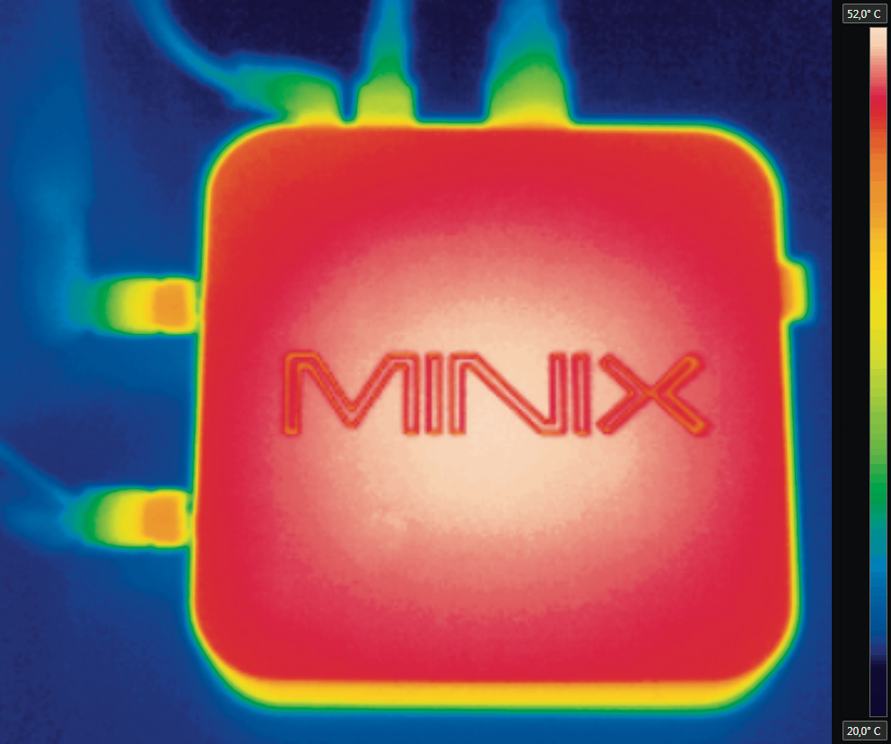 Die lüfterlose Kühlung funktioniert zuverlässig, weil Minix auf besonders niedrige Leistungsaufnahme achtet: Der NGC-1 bleibt sowohl im Leerlauf (3,9 Watt) als unter Last (15 Watt) sparsamer als die Zotac ZBox CI323 mit demselben Intel-Chip [1]. Erst bei lang anhaltender Volllast, die in der Praxis kaum jemals vorkommt, erwärmt sich das Gehäuse des NGC-1 auf knapp 50 °C – das ist noch akzeptabel.