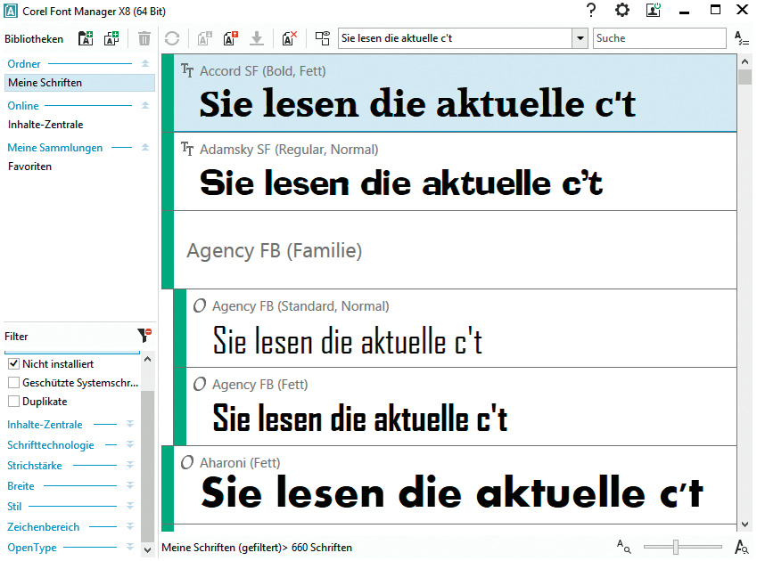 Das sieben Einzelanwendungen umfassende Grafikpaket CorelDraw Graphics Suite erhält in Version X8 zum ersten Mal einen Schriftmanager aus eigenem Hause – die Vorgängerversionen hatten Bitstreams Font Navigator an Bord. Das Font Manager getaufte Programm verwaltet Schriftensammlungen, soll die Suche nach bestimmten Schrifttypen erleichtern und bietet eine Vorschaufunktion.