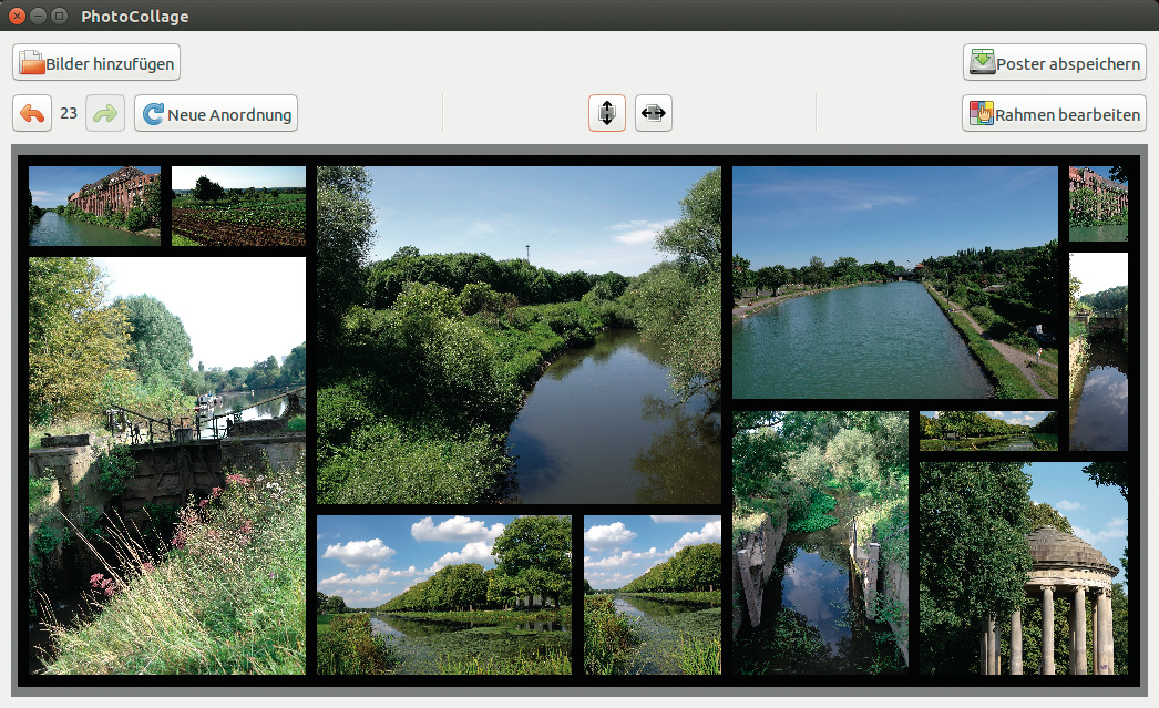 PhotoCollage ist ein typisches Linux-Tool, denn es kann zwar nur eine Sache, die aber gut: Aus einzelnen Bildern baut PhotoCollage ein Bild wahlweise im Hoch- oder Querformat, das sich ausdrucken oder bei einem Dienstleister als Poster bestellen lässt. Dabei liefert das Python-Tool sehr schnelle Ergebnisse.