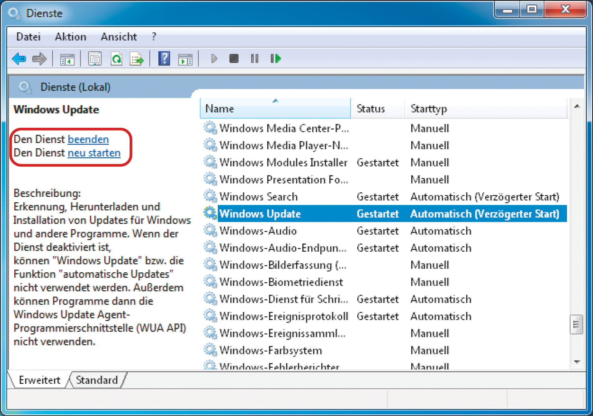 Um den Ordner zu löschen, müssen Sie zwei Dienste deaktivieren. Öffnen Sie die Diensteverwaltung, indem Sie die Windows-Taste drücken, „Dienste“ eingeben und mit der Eingabetaste bestätigen. Markieren Sie den Eintrag „Windows Update“ und klicken Sie links der Dienstliste auf „Den Dienst beenden“; erledigen Sie danach das Gleiche für den Eintrag „Intelligenter Hintergrundübertragungsdienst“. Löschen Sie dann via Windows-Explorer den Ordner „SoftwareDistribution“ in C:\Windows. Er wird später automatisch neu angelegt. Starten Sie die beiden Dienste in der Diensteverwaltung wieder, öffnen Sie Windows Update und lassen Sie nach Aktualisierungen suchen.