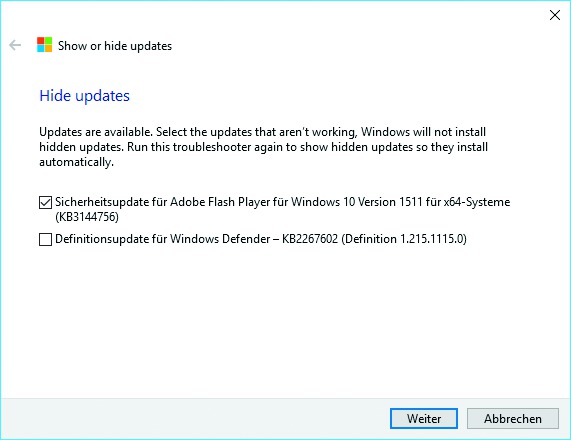 !!! Microsoft bietet dafür das Tool „wushowhide.diagcab“ an (siehe c’t-Link). Ist das unerwünschte Update bereits installiert, müssen Sie es zunächst entfernen – wie im vorigen Tipp beschrieben. Starten Sie dann das Tool. Klicken Sie auf „Weiter“ und auf „Hide updates“ und setzen Sie ein Häkchen vor den unerwünschten Patch. Klicken Sie wieder auf „Weiter“ und zum Abschluss auf „Schließen“. Ausgeblendete Updates lassen sich analog dazu mit der Option „Show hidden Updates“ wieder zur Installation freigeben.