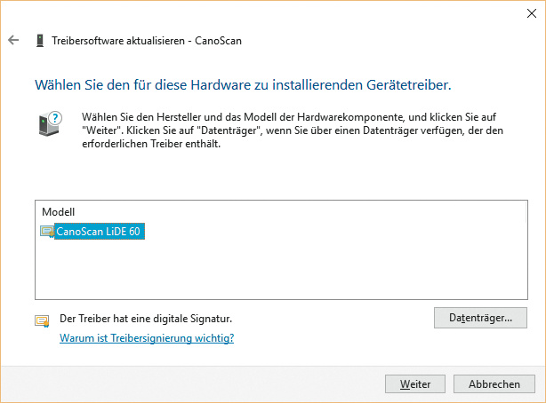 Ignorieren Sie in der Liste den angebotenen Gerätetreiber und klicken Sie auf „Datenträger“. Danach navigieren Sie zu dem Verzeichnis, in dem die entpackte Treibersoftware liegt. Als einzige passende Hardware wird Ihnen nun der CanoScan LiDE 60 angezeigt. Den wählen Sie aus und bestätigen Ihre Wahl im nächsten Fenster, das Sie vor der Installation des Treibers warnt, weil er angeblich nicht kompatibel sei. Tatsächlich lässt er sich aber problemlos installieren und funktioniert auch mit dem CanoScan LiDE 35. (ciw@ct.de)