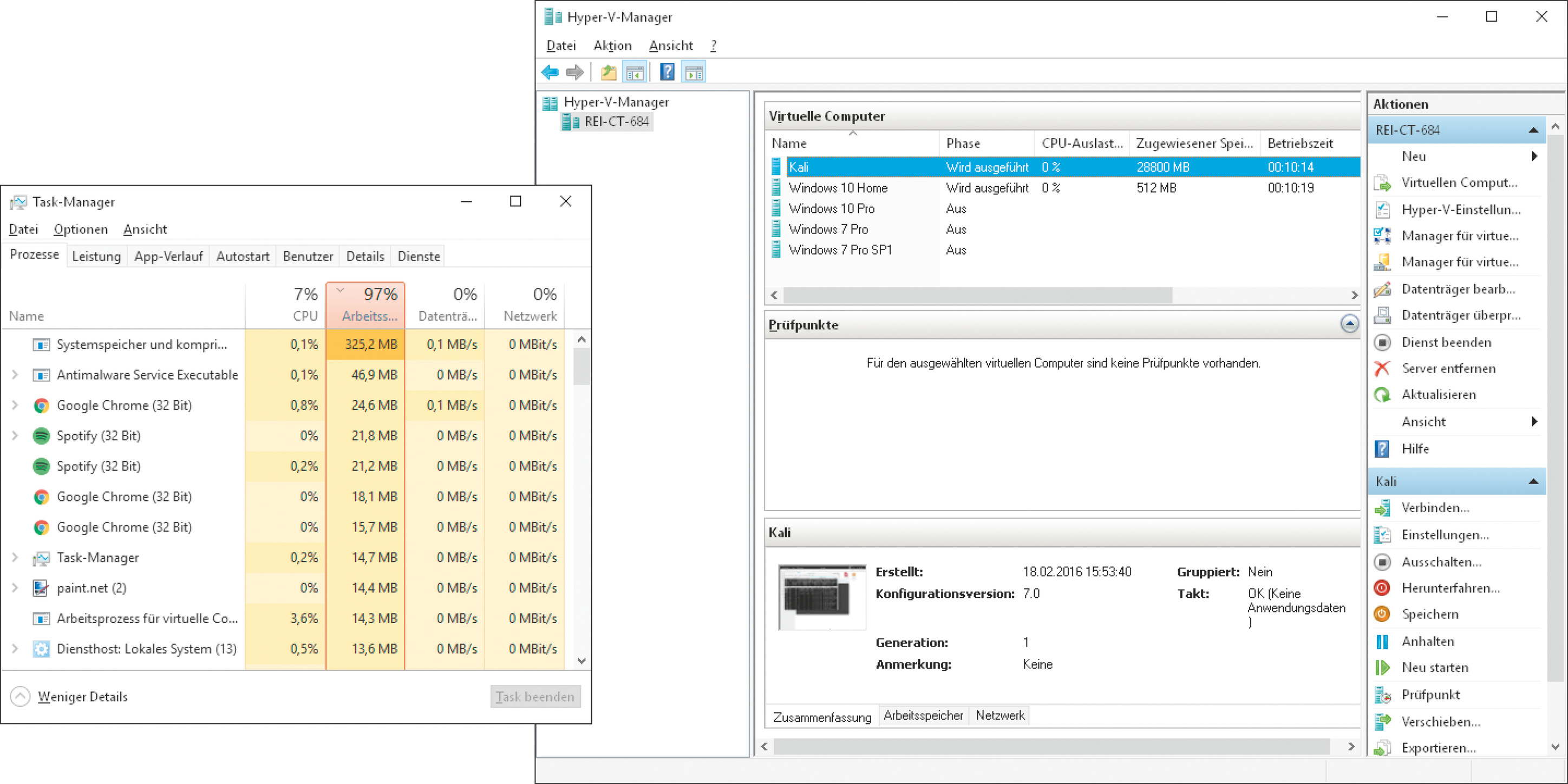 !!! Möglicherweise nutzen Sie die Virtualisierungs-Lösung Hyper-V, die seit Windows 8 bei der Pro- und Enterprise-Versionen zu den Bordmitteln gehört. Wenn Sie dort eine virtuelle Maschine mit der Standardeinstellung „Dynamischen Arbeitsspeicher für diesen Computer verwenden“ angelegt haben, schnappt sich das Gast-Betriebssystem bei Bedarf so viel RAM, wie es kann – das voreingestellte und bei der Einrichtung nicht sichtbare Limit beträgt rund 1048 GByte. Erzeugt ein Prozess innerhalb des Gast-Betriebssystems ein Speicherloch, geht auch dem Wirt früher oder später der Speicher aus.