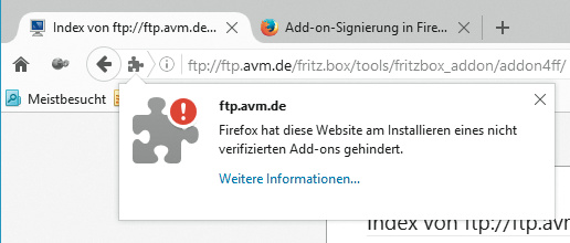 ??? Ich wollte ein Firefox-Add-on von AVM installieren, das die Arbeit mit meiner Fritzbox erleichtert. Doch die Installation bricht mit einer Fehlermeldung ab, dass die Installation nicht signierter Add-ons nicht möglich sei. Was kann ich tun?