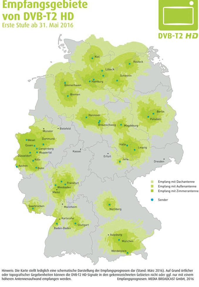 Ab dem 31. Mai soll in 18 Ballungsräumen das neue terrestrische Digitalfernsehen DVB-T2 HD mit diversen Sendern in Full HD (1080p50) starten: Bremen/Unterweser, Hamburg/Lübeck, Kiel, Rostock, Schwerin, Hannover/Braunschweig, Magdeburg, Berlin/Potsdam, Jena, Leipzig/Halle, Düsseldorf/Rhein/Ruhr, Köln/Bonn/Aachen, Rhein/Main, Saarbrücken, Baden-Baden, Stuttgart, Nürnberg und München/Südbayern.