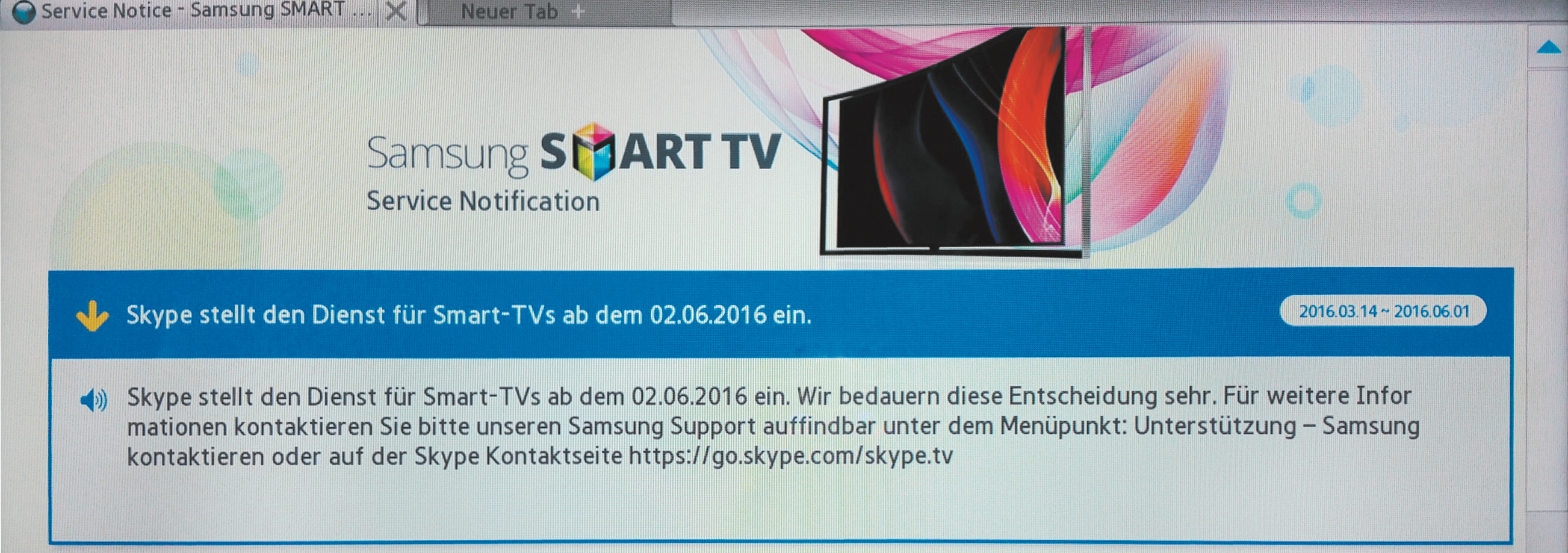 Dass der Skype-Dienst abgeschaltet wird, ist kein Problem für mich. Aber die tägliche Meldung dazu, die ich nach dem Einschalten des TVs bis zum Juni wegdrücken muss, nervt sowas von. Genau wie alle anderen Meldungen über Änderungen an den TV-Diensten: Die können nicht bestätigt und damit beendet werden. Abschalten der Datendienste ist da auch keine praktikable Lösung.