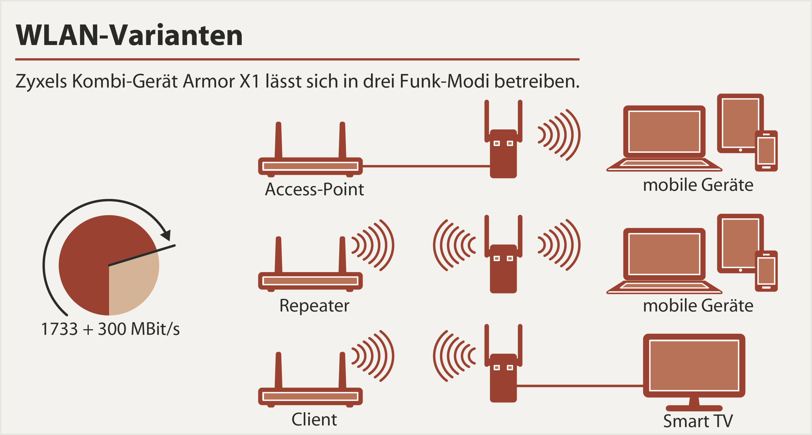 Zyxels Kombi-Gerät Armor X1 lässt sich wahlweise als Gigabit-Access-Point, WLAN-Repeater oder WLAN-Client nutzen. Als Client bringt der Armor kabelgebundene Geräte über seine vier GBit-Ethernet-Ports ins WLAN.