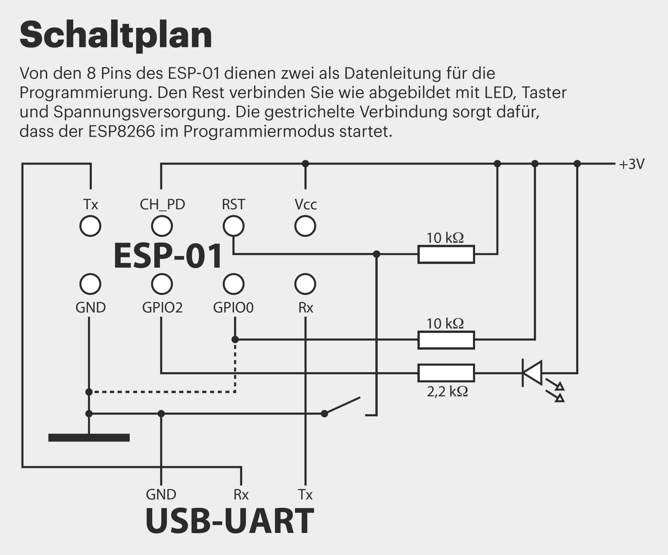 Genau dafür eignet sich das in der Maker-Szene beliebte Modul ESP-01 mit dem Mikrocontroller ESP8266. Seine 80-MHz-CPU hat genug Dampf für verschlüsselte Kommunikation per TLS 1.1 und sein Schlafmodus verbraucht so wenig Energie, dass der Button mit zwei AAA-Batterien jahrelang läuft. Die Platine mit SoC, Antenne und Stiftleiste zum Anschließen ist nur so groß wie eine Fingerkuppe und passt problemlos in das Gehäuse von batteriebetriebenen LED-Schranklichtern (Stichwort: Stick & Push). Mit einem USB-Seriell-Konverter für nicht mal zwei Euro schließen Sie das ESP-Modul am Rechner an und programmieren es mit der Arduino-Entwicklungsumgebung (IDE). Die selbst geschriebene Firmware in C kommt dank guter Bibliotheken für den ESP8266 mit nur 150 Zeilen Quelltext aus.