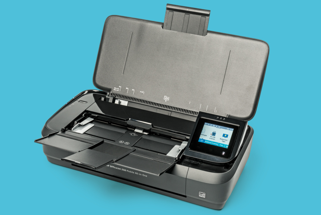 Der HP OfficeJet 250 druckt, scannt und kopiert unterwegs Angebote und Verträge ohne Kabel. Die Energie liefert ein Akku, für die Daten gibts WLAN.