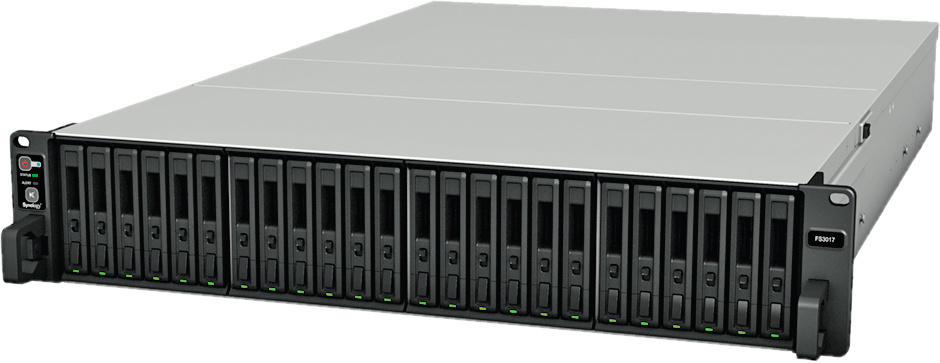 Der 11.000 Euro teure SSD-Netzwerkspeicher FS3017 ist mehr Server als NAS: Er soll laut Synology bis zu 200.000 Zugriffe pro Sekunde (IOPS) schaffen und sich so besonders für Big-Data-Analyse, Videonachbearbeitung, Virtualisierung und Datenbanken in Firmen eignen. Den Datenumschlag zwischen Netzwerk und Speicher erledigen gleich zwei mit 2,4 GHz getaktete 6-Kern-Prozessoren (Xeon E5-2620). Die vorhandenen 64 GByte RAM kann man auf maximal 512 GByte ausbauen (DDR4 ECC-RDIMM). In die 24 Buchten lassen sich 2,5-Zoll-SSDs aller namhaften Hersteller einsetzen, wahlweise mit SATA6G- oder SAS-Schnittstelle. Zum LAN hin gibt es zwei 10-GBit/s-RJ45-Ports; per PCIe-3.0-Slot lässt sich optisches Ethernet mit 10, 25 oder 40 GBit/s nachrüsten.