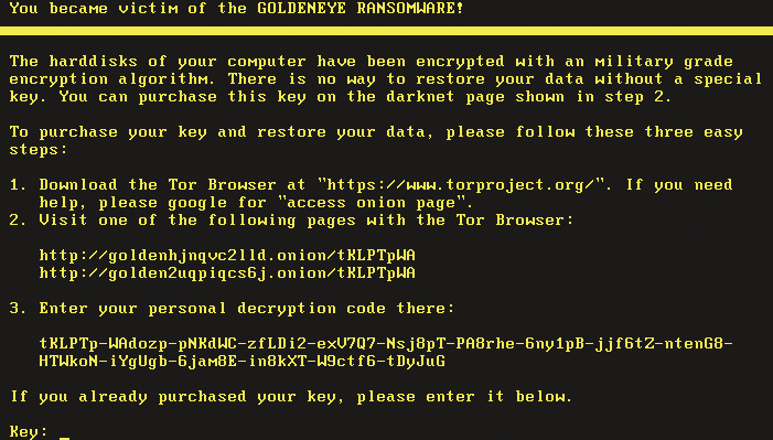 Der Name ist ganz offensichtlich eine Anspielung auf den James-Bond-Film „GoldenEye“ aus dem Jahr 1995. In diesem Film muss James Bond abtrünnige russische Militärs und ein Verbrechersyndikat stoppen, die den Schlüssel (das sogenannte GoldenEye) zu einer orbitalen EMP-Waffe des russischen Militärs geklaut haben und durch dessen Einsatz reich werden wollen. Diese Waffe besteht aus mit Atomsprengköpfen bestückten Satelliten, die im Orbit gezündet werden und so mittels EMP elektronische Geräte unbrauchbar machen. Die beiden Satelliten im Film heißen Petya und Mischa, und sie werden von einem russischen Hacker-Genie namens Boris kontrolliert. Es deutet also alles drauf hin, dass die drei Trojaner-Varianten von denselben Drahtziehern stammen. Vielleicht sitzen diese in Russland, vielleicht mögen sie aber auch einfach nur Pierce Brosnans Debüt in der Rolle des James Bond.