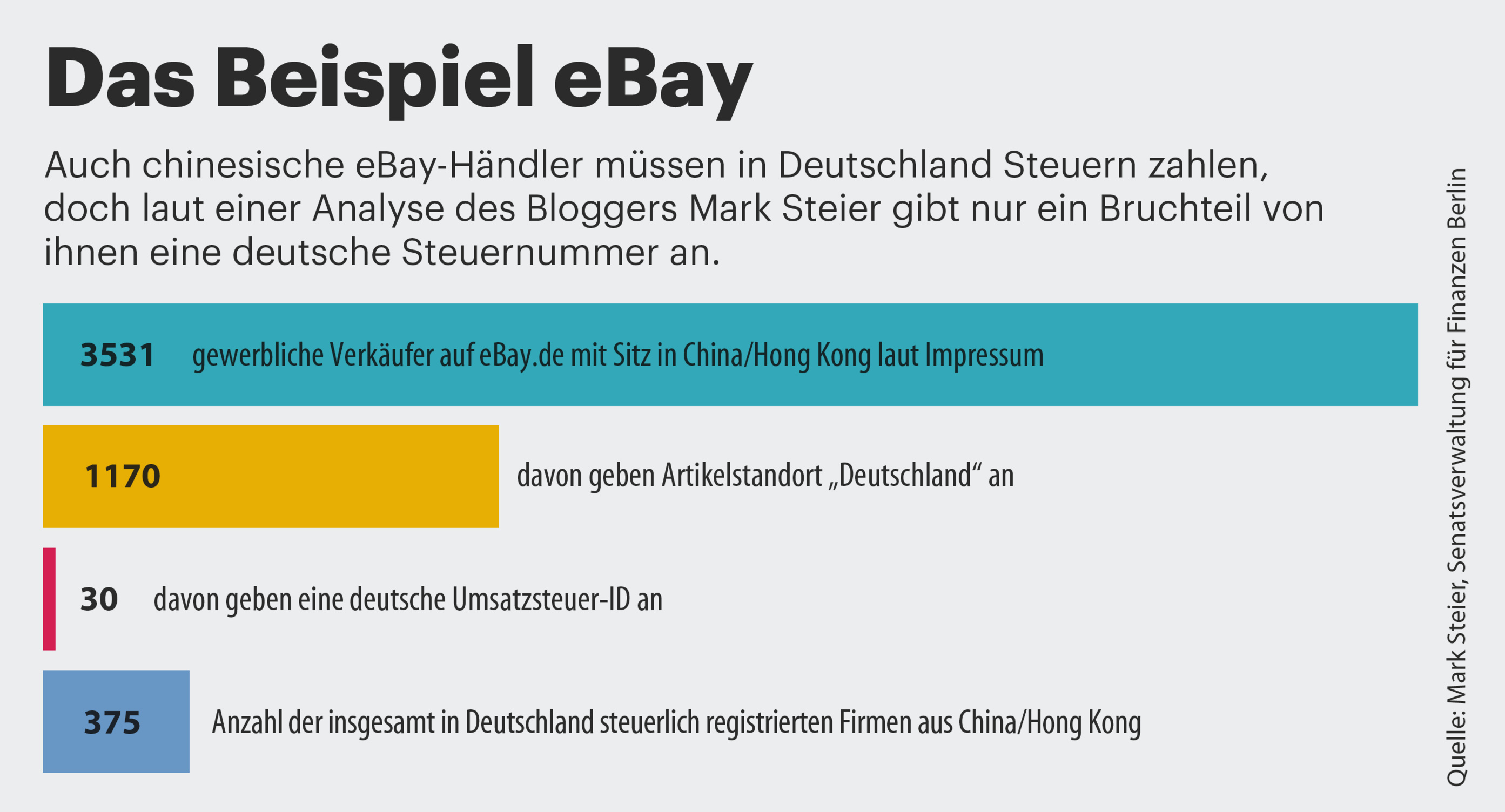 Mark Steier, ehemals selbst Online-Händler, heute Blogger und Berater, schätzt, dass dem deutschen Fiskus durch chinesische Händler auf den großen Plattformen jährlich 500 bis 800 Millionen Euro entgehen – „konservativ gerechnet“. Steier hat über die APIs der Marktplätze von eBay und Amazon Händlerdaten ausgelesen. Seine Erkenntnisse passen zu offiziellen Zahlen der Finanzverwaltung: Nur 375 chinesische Firmen sind in Deutschland umsatzsteuerlich registriert.