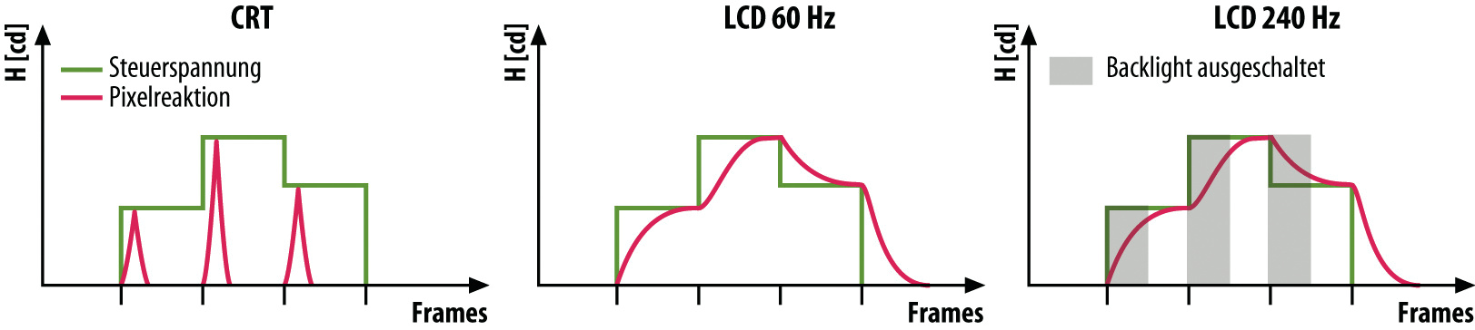 Im Unterschied zu Röhrenmonitoren, wo ein Lichtstrahl eine Phosphorschicht zum Leuchten bringt, baut ein Flachbildschirm sein Bild auf, indem ein Flüssigkristall je nach Orientierung das LED-Backlight durchlässt oder blockiert. Allerdings richtet sich der Kristall nur träge aus. Ist er damit noch nicht fertig, wenn das nächste Bild aufgebaut werden soll, zeigen bewegte Objekte, etwa die Spielfigur oder der am Spieler vorbeiziehende Hintergrund, auch bei hoher Bildrate Bewegungsunschärfe.