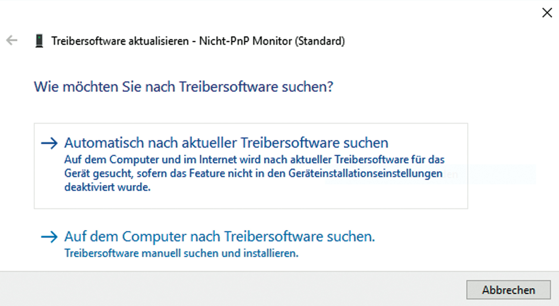 In selteneren Fällen liegt es am Monitor-Treiber. Etwa dann, wenn die Kommunikation zwischen Grafikkarte und Display via DDC (Display Data Channel) misslingt. Einen aktuellen Monitortreiber können Sie direkt im Gerätemanager einspielen lassen. Machen Sie dazu einen Rechtsklick auf den Eintrag für Ihren Monitor und wählen Sie „Treibersoftware aktualisieren“, dann „Automatisch nach aktueller Treibersoftware suchen“.
