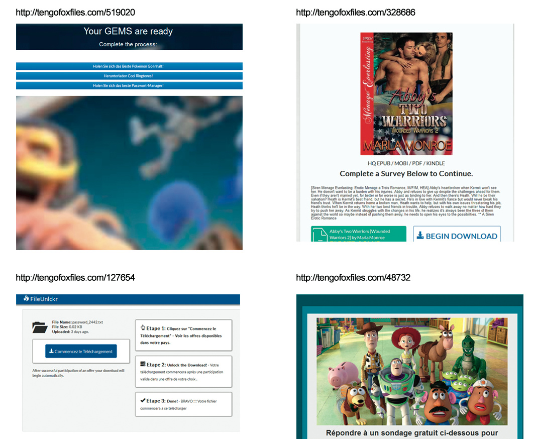 Indem ich die Zahl am Ende der URL durch andere ersetze, gelange ich auf verschiedene Unterseiten des Werbe-Netzwerkes, die sich vor allem durch die grafische Oberfläche unterscheiden. Das Schema ist jedoch immer dasselbe: Um eine bestimmte Aktion auszuführen, müssen Opfer zunächst einen Werbe-Link anklicken oder an einer Umfrage teilnehmen. Offenbar handelt es sich dabei um ein Geschäftsmodell für Online-Kriminelle, das in vielen Apps und Web-Anwendungen zum Einsatz kommt.