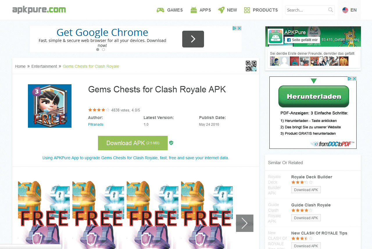 Die Macher der zwischen 100.000 und 500.000 Mal heruntergeladenen App „Gems Chest for Clash Royale“ lockten auf Google Play mit folgendem Text: „Hi im clash royale fan and i have developed the best guide to obtain easy free chests and legendary cards with my advices. […] No hacks, only guide of text and image.“ Doch dabei handelt es sich um kein Helferlein, das kostenlose Spiele-Items verschafft, sondern eine Malware, die sich im Fahrwasser des erfolgreichen Spiels „Clash Royale“ (Android: 100 bis 500 Millionen Installationen) auf Geräte schleichen will. Die App befand sich über mehrere Monate von Googles Sicherheitsmechanismen unerkannt im offiziellen App Store, wurde mittlerweile aber entfernt. Der Schädling blendet unerwünschte Werbung ein und ruft auf Kosten des Nutzers teure Premium-Nummern im Ausland an. Entdeckt haben die Malware Sicherheitsforscher von Checkpoint und sie CallJam getauft.