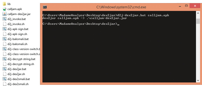 Um herauszufinden, auf welche Weise CallJam Gebrauch von den angeforderten Berechtigungen macht, schaue ich mir im nächsten Schritt den Programmcode an, der sich im APK in einer Datei mit der Endung .dex befindet. Dabei handelt es sich um Bytecode im Dalvik-Executable-Format. Auf Android-Geräten sorgt die Dalvik VM beziehungsweise die Android Runtime für eine Übersetzung in maschinenlesbaren Code und die Ausführung. Um dieses Format wieder in eine für Menschen lesbare Form zurückzuwandeln, müssen die ursprünglichen Java-Klassen wiederhergestellt werden, sprich: man muss die .dex-Datei dekompilieren.