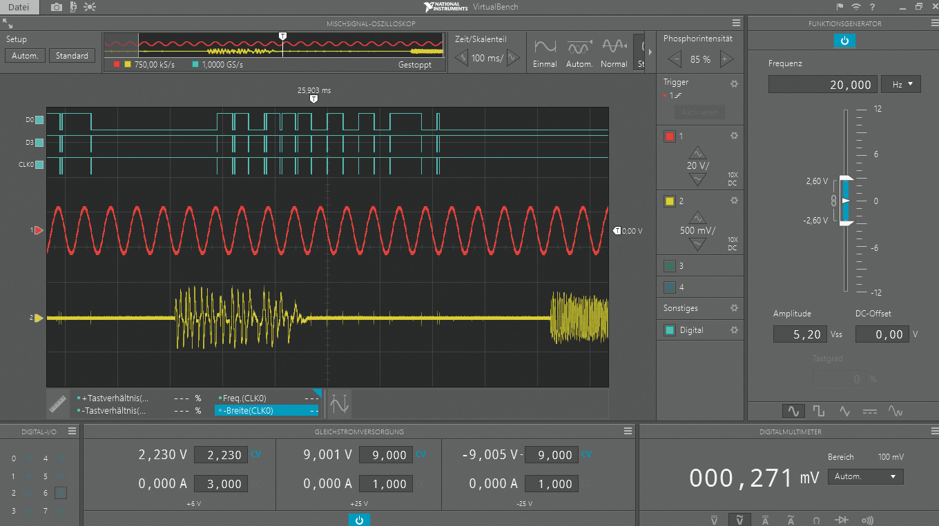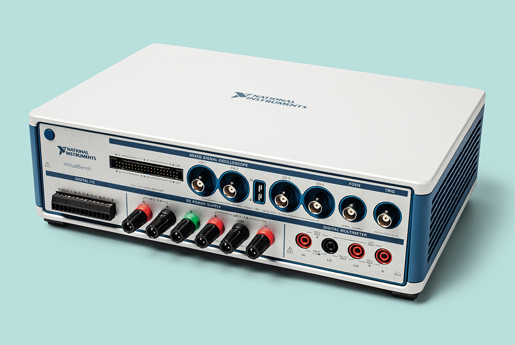 Das Universal-Messgerät VirtualBench von National Instruments kombiniert ein Labornetzteil mit einem Mischsignal-Oszilloskop, einem Funktionsgenerator, einem Digitalmultimeter sowie einer digitalen I/O-Schnittstelle.