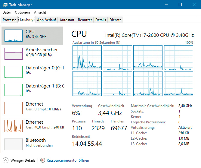 Ist die Seite „Prozesse“ eher dazu gedacht, den Ressourcenverbrauch einzelner Programme zu begutachten, findet sich eine übersichtliche Darstellung der Gesamtauslastung des Systems auf der Seite „Leistung“. Auf der linken Seite zeigen kleine Diagramme die Auslastung der wichtigsten Ressourcen im zeitlichen Verlauf, ihre Beschriftungen geben den aktuellen Wert wieder. Durch einen Klick auf eine Ressource ruft man weitere Details auf.