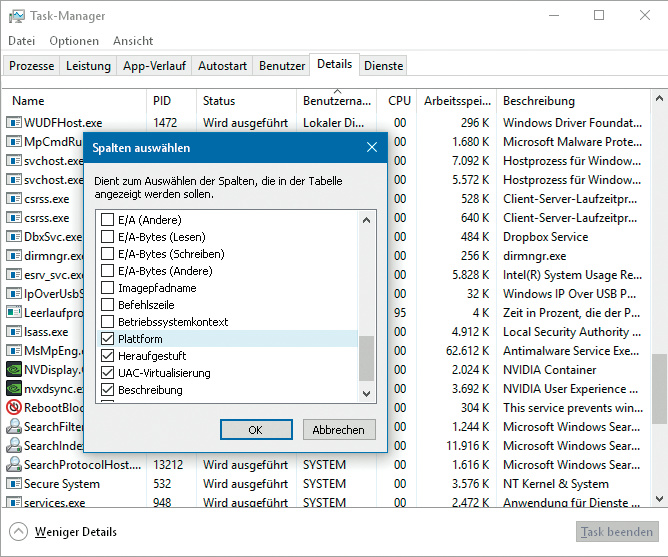 Interessant sind auch die Spalten „Heraufgestuft“ und – auf 64-bittigen Windows-Installationen – „Plattform“: Erstere enthält ein „Ja“ bei allen Prozessen, denen die Benutzerkontensteuerung Administratorrechte verliehen hat; diese Prozesse haben also unter anderem Schreibzugriff im Systemordner und im Schlüssel HKEY_LOCAL_MACHINE in der Registry. Unter „Plattform“ steht, ob es sich bei dem Prozess um ein 32- oder ein 64-Bit-Programm handelt.