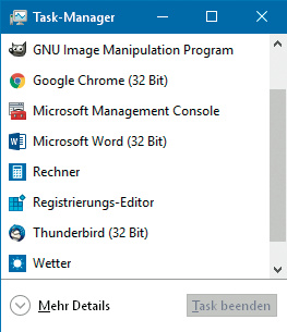 In der Grundeinstellung besteht der Task-Manager lediglich aus einer minimalistischen Liste der gerade geöffneten Programme und Apps. Nicht einmal vollständig ist sie – Explorer-Fenster fehlen zum Beispiel. Über die Schaltfläche „Task beenden“ kann man Programme schließen; ein Kontextmenü bietet ein paar zusätzliche Funktionen.