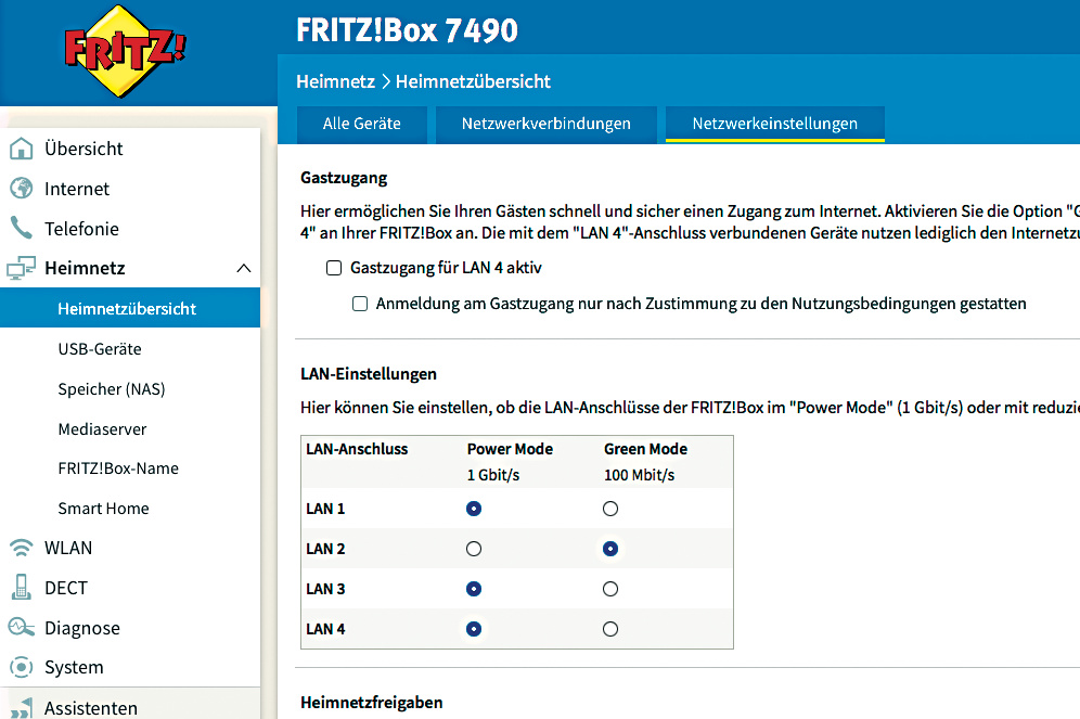 Bei manchen Gerätepaaren scheitert die Aushandlung der Geschwindigkeit, etwa mit alten DSL-Modems und modernen WLAN-Routern. Stellen Sie dann den zugehörigen Port im Router fest auf Fast-Ethernet ein. Falls das nicht möglich ist, schalten Sie einen Gigabit-Switch dazwischen. Selbiges gilt für ältere IPTV-Receiver und andere Kellergeister.