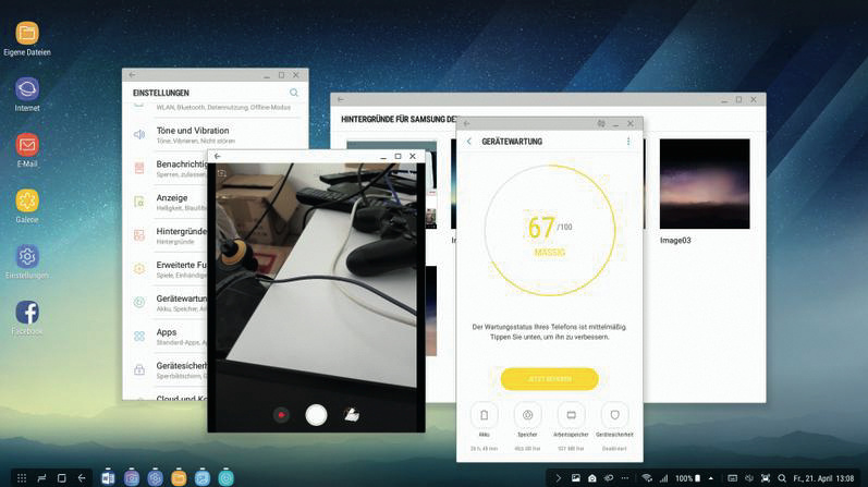 Die Performance des S8 ist auch im Desktop-Modus ausreichend, selbst mehrere Anwendungen nebeneinander lassen sich flüssig bedienen. DeX kühlt das Telefon permanent mit einem Lüfter, der aber so gut wie nicht zu hören ist.