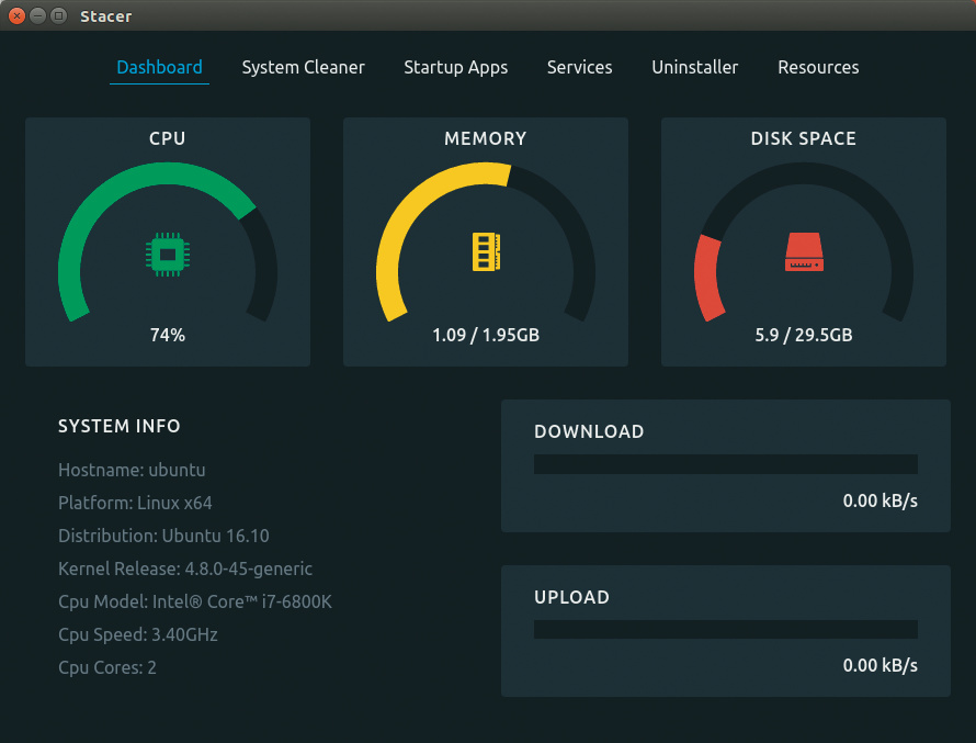 Auf einer schicken Oberfläche visualisiert Stacer mit bunten Balken die aktuelle Auslastung des Prozessors, des Hauptspeichers, den Füllstand der Festplatte sowie die aktuelle Down- und Upload-Rate im Netzwerk. Ergänzend erfährt man die Ubuntu-Version, den genutzten Kernel und das verbaute Prozessor-Modell. Drei Diagramme zeichnen unter „Resources“ zudem Prozessorlast, verwendeten Arbeitsspeicher und den Netzwerkverkehr über die letzten 30 Sekunden nach.