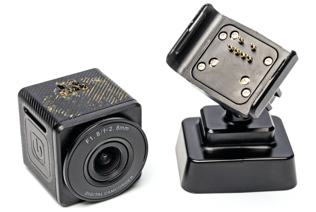 Die NavGear Dashcam NX-4318-905 besteht aus einem kleinen Kamerafuß für die Windschutzscheibe und dem würfelförmigen Kameramodul mit nur 3,3 Zentimeter Kantenlänge. Die Stromzufuhr erfolgt über den Fuß, ein passender Kfz-Lader liegt bei. Die Kamera ist zusätzlich mit einem kleinen Akku ausgestattet, sodass man sie für circa 20 Minuten als Action-Cam einsetzen kann.