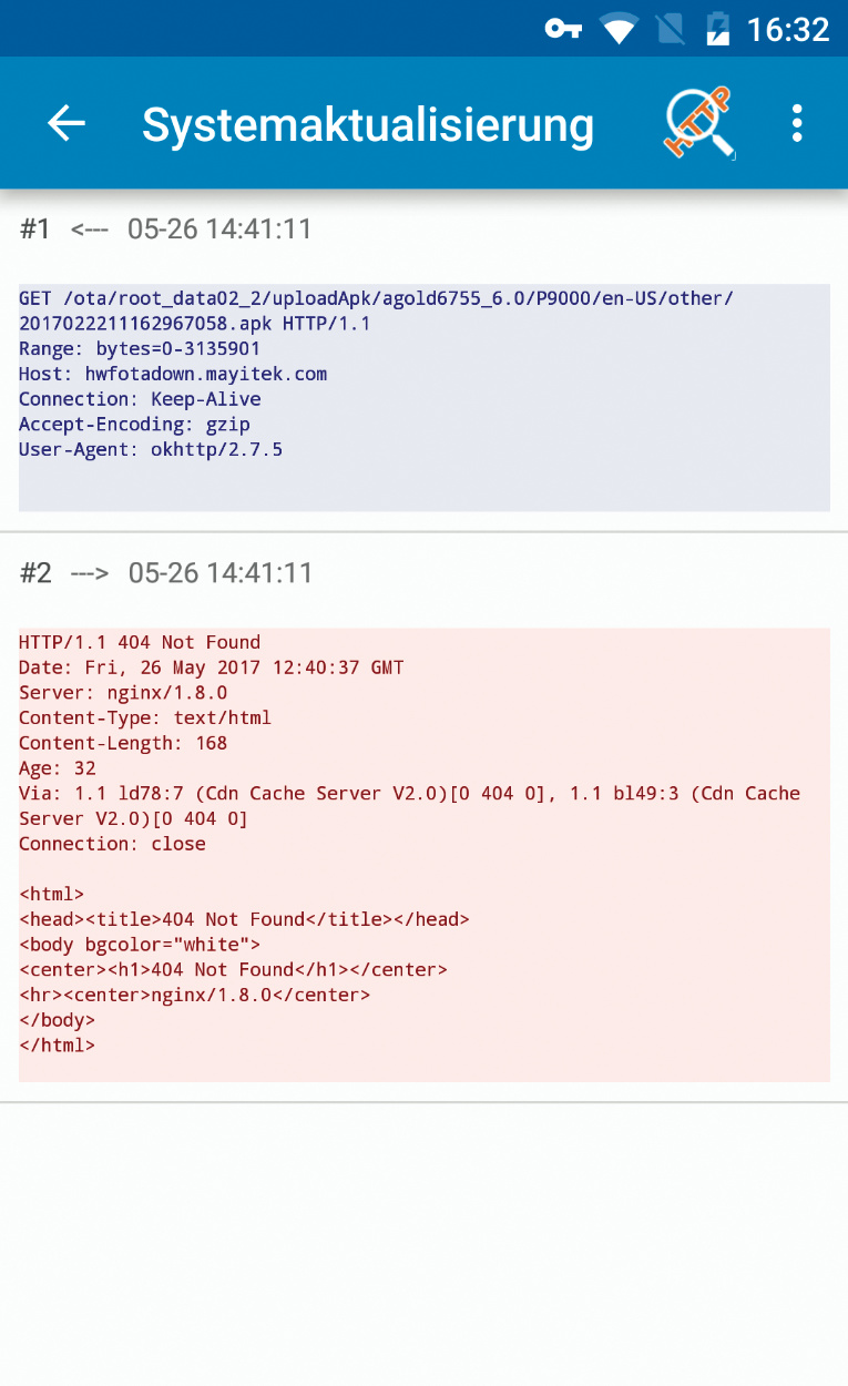 Um den anfallenden Datenverkehr zu reduzieren, nutzen viele Systemkomponenten und Apps das Kompressionsverfahren gzip. Das erkennen Sie zum einen an dem HTTP-Header „Content-Encoding: gzip“ und zum anderen daran, dass unterhalb der Header lediglich eine scheinbar zufällige Kombination diverser Zeichen angezeigt wird. Packet Capture verwandelt die komprimierten Daten in Klartext, wenn Sie oben rechts auf die Lupe mit dem Schriftzug „HTTP“ drücken. Dadurch interpretiert die App die geöffnete Verbindung als HTTP.