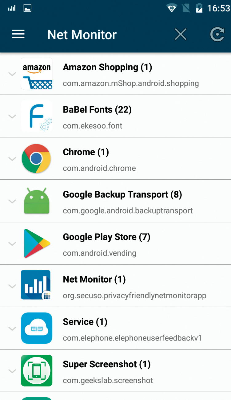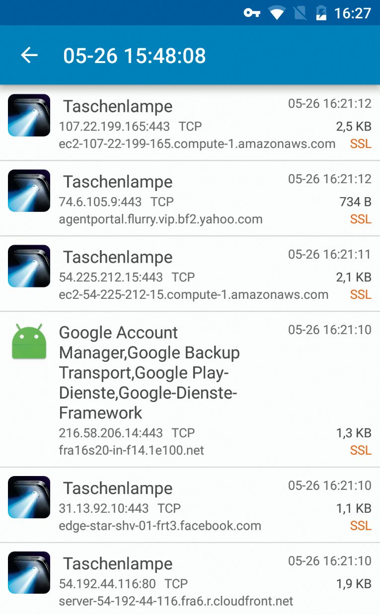 Es öffnet sich die Verbindungsliste, die auf einen Blick alle wichtigen Informationen zu den einzelnen Datenverbindungen anzeigt: Links das Icon der App, von der die Verbindung ausging, mittig der Name der App, darunter die IP-Adresse des Verbindungspartners und der Ziel-Port, das Protokoll (TCP oder UDP) und in der dritten Zeile schließlich der Hostname des Gegenübers. Rechts erscheinen der genaue Zeitpunkt, die Menge der übertragenen Daten und im Fall von verschlüsselten Verbindung die Kennzeichnung „SSL“.