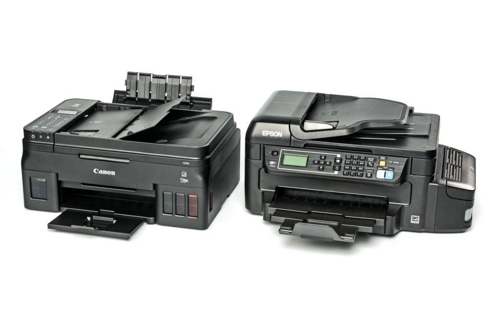 Die Multifunktionstintendrucker Canon Pixma G4500 und Epson EcoTank ET-4550 sind zwar teurer als Patronenmodelle, drucken aber mit Originaltinte aus der Flasche unschlagbar günstig.