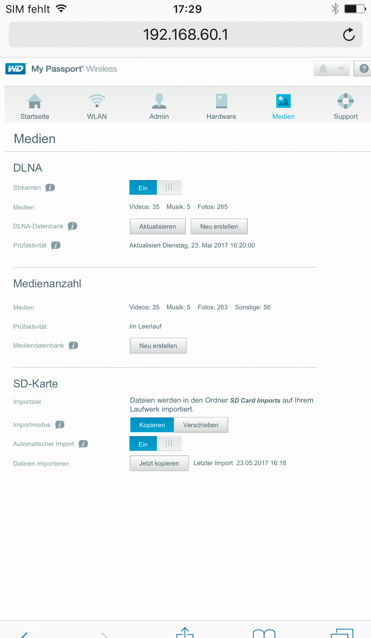 Für die Sicherung von Kamerafotos bleibt daher nur, die SD-Karte aus der Kamera zu nehmen und sie in die Festplatte zu stecken. Einmal per WD-App oder Browser passend konfiguriert, importiert die My Passport automatisch alle Daten von der SD-Karte und legt sie in einem Verzeichnis mit der SD-Karten-Kennung und dem aktuellen Datum ab.