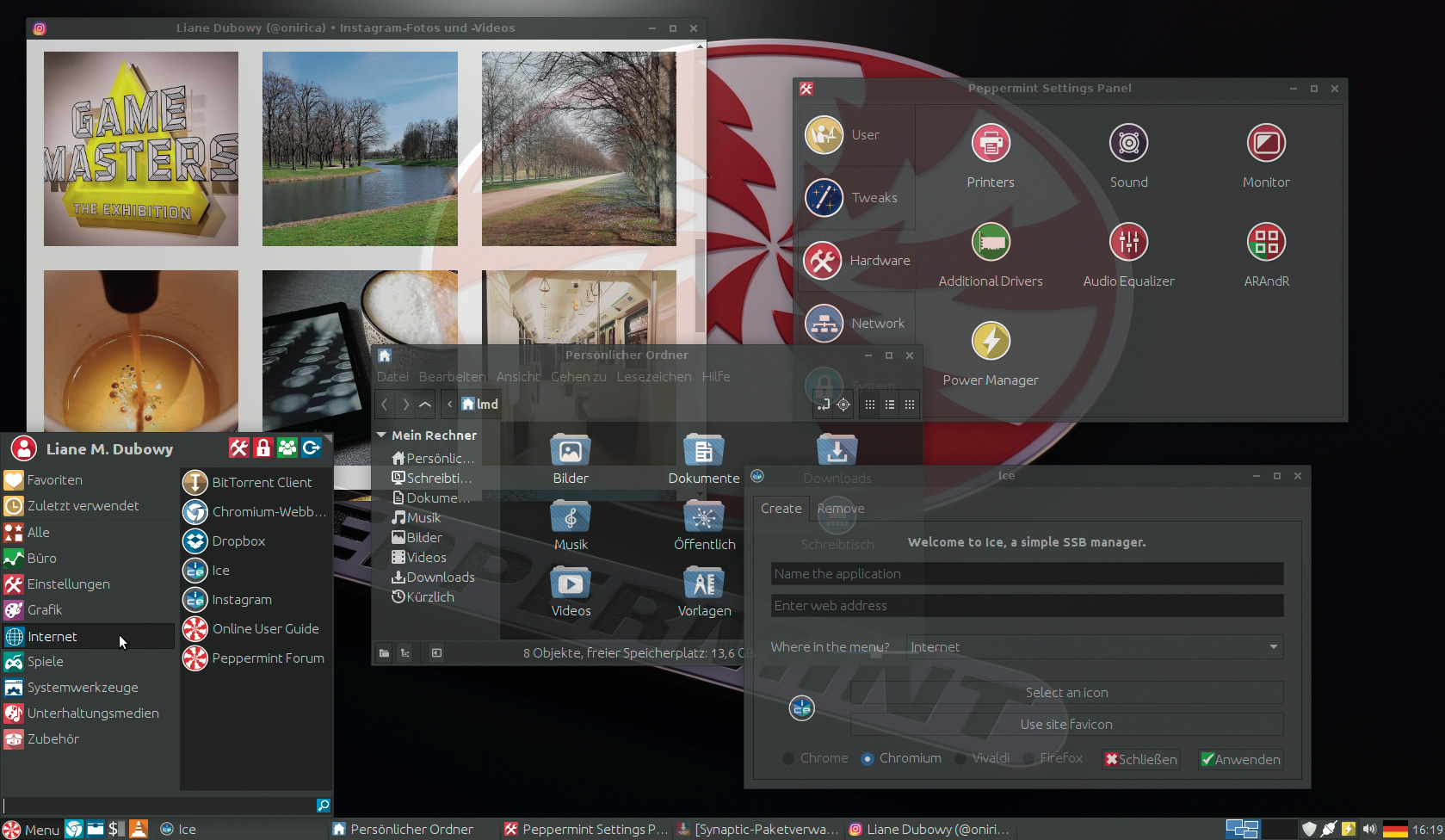 Die Linux-Distribution Peppermint ist auch in Version 8 ganz auf Web-Anwendungen ausgerichtet. Nur wenige Programme sind vorinstalliert, dafür bietet Ice eine einfache Möglichkeit, Web-Apps wie Facebook, Instagram oder die Online-Bildbearbeitung Pixlr in den Linux-Desktop zu integrieren. Ice bringt eine grafische Oberfläche zum Anlegen solcher „Site Specific Browsers“ (SSB) mit, die dann auch im Menü auftauchen.