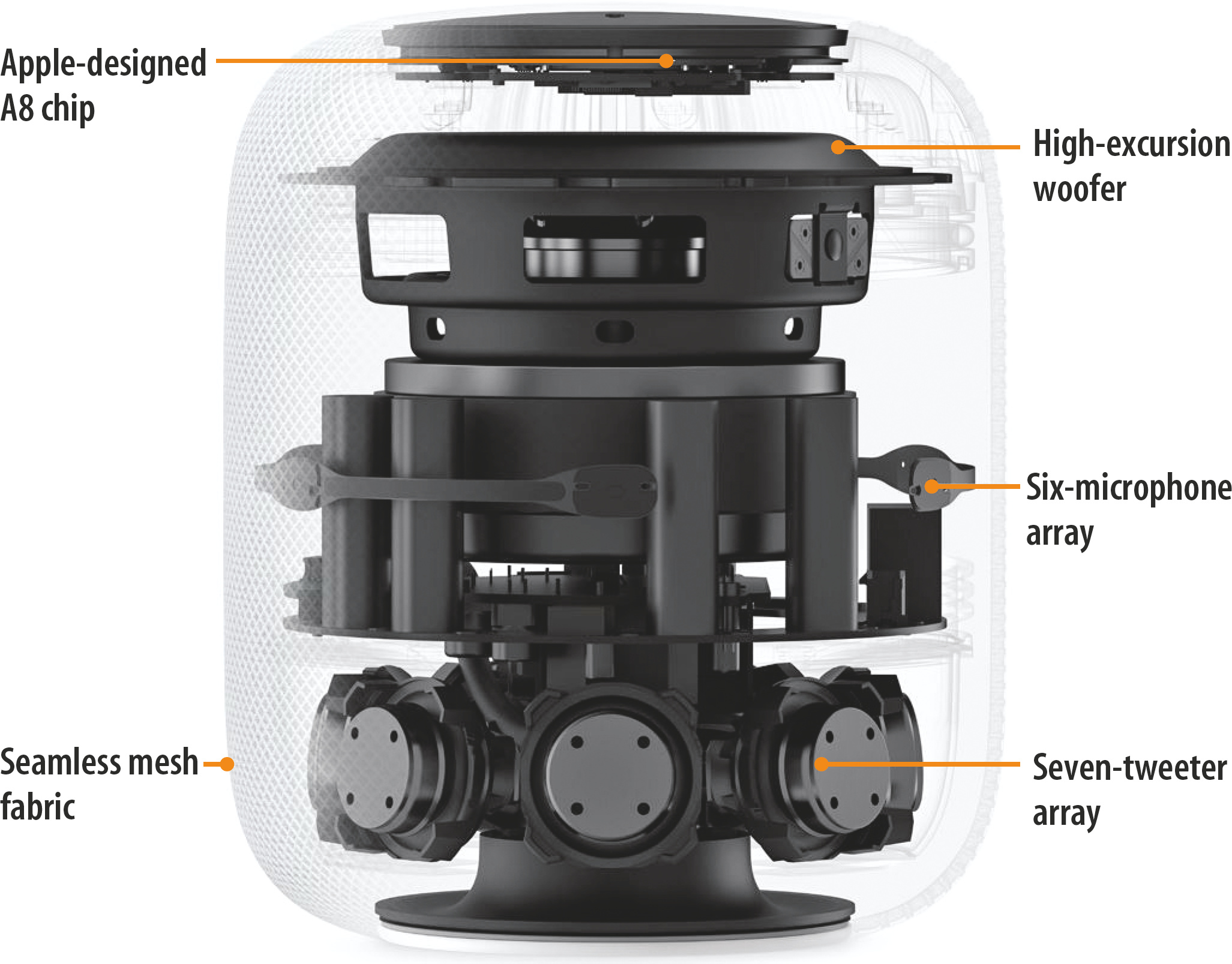 Apple will Ende des Jahres einen neuen Lautsprecher mit Sprachsteuerung namens HomePod auf den Markt bringen. Er soll die Klangqualität bisheriger Sonos-Lautsprecher mit den Sprachfunktionen von Amazons Echo kombinieren. Obwohl der Lautsprecher nur 17 cm hoch und 14 cm breit ist, verspricht Apple raumfüllenden HiFi-Sound. Erzeugt wird dieser von einem Tieftöner sowie sieben Hoch-/Mittel-Tönern, die nach allen Seiten abstrahlen. Ein Mikrofon-Array mit sechs Kapseln misst den von Wänden reflektierten Schall und richtet das Klangfeld passend auf den Raum aus. Stellt man zwei HomePods auf, arbeiten sie als Stereo-Lautsprecher zusammen.