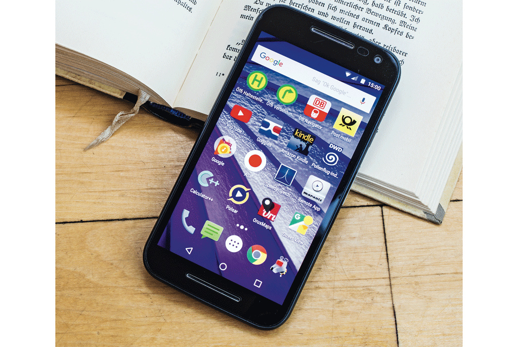 Das Motorola Moto G3 habe ich im Juli 2016 wegen seines exzellenten Preis/Leistungs-Verhältnisses gekauft: mit 2 GByte RAM und 16 GByte Flash-Speicher für 180 Euro. Damals war schon die vierte Moto-G-Generation auf dem Markt, bot mir für den Mehrpreis aber zu wenig Vorteile – und wäre mir auch zu groß: 5 Zoll finde ich genau richtig. Das Display löst nicht besonders hoch auf (1280 × 720), für mich als Gleitsichtbrillenträger jenseits der 50 spielt das aber keine Rolle. Das auf 2,4 GHz beschränkte WLAN rede ich mir mit dem niedrigen Preis schön.