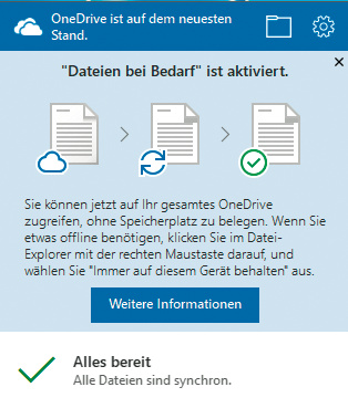 Microsoft hat über das Windows-Insider-Programm den Build 16215 veröffentlicht und ermöglicht damit einen ersten Blick auf einige Funktionen, die auf der Build-Konferenz angekündigt wurden. Für OneDrive auf Windows 10 kommt eine Funktion zurück, die viele Nutzer aus Windows 8 kennen: die Möglichkeit, „Dateien bei Bedarf“ vorzuhalten. Jede Datei und jedes Verzeichnis kann man entweder automatisch synchronisieren oder als Platzhalter anzeigen. Die Hüllen der Dateien verbrauchen keinen Speicherplatz auf der Festplatte, Windows zeigt aber ihre Metadaten an und lädt sie beim Öffnen automatisch nach – im Explorer weist eine blaue Wolke darauf hin, dass sich eine Datei in der Cloud befindet.