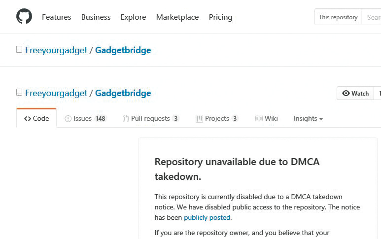 Die Entwicklerplattform GitHub hat die gesamte Projektseite der Open-Source-App Gadgetbridge offline genommen – als Reaktion auf einen Copyright-Vorwurf. Die von einem herstellerunabhängigen Team entwickelte Gadgetbridge-App steuert hauptsächlich die Pebble-Uhr, aber auch andere Geräte, etwa den Fitnesstracker Xiaomi Mi-Band. Nun wirft der Anbieter eines Drittanbieter Tools für das Mi-Band dem Entwickler-Team von Gadgetbridge vor, Gadgetbridge nutze sein Bildmaterial und habe durch „Reverse Engineering“ Code aus seiner App „Tools & Mi Band“ nachkonstruiert.