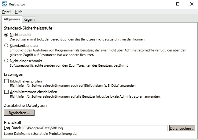 ¯!!! Restric’tor selbst schreibt keine Logs, verhindert keine Programmstarts und gibt auch keine Fehlermeldung aus, wenn ein Programmstart an den Einstellungen scheitert. Um all das kümmert sich Windows – Restric’tor schreibt lediglich Registry-Einträge und steuert damit die in Windows vorhandenen Protokoll- und Schutzmechanismen. Restric’tor läuft auch nicht im Hintergrund – wenn Sie sein Fenster schließen, verschwindet es komplett aus dem Speicher. Sie könnten es nach dem Festlegen der Einstellungen sogar von der Festplatte löschen und die SRP würden weiterhin funktionieren.