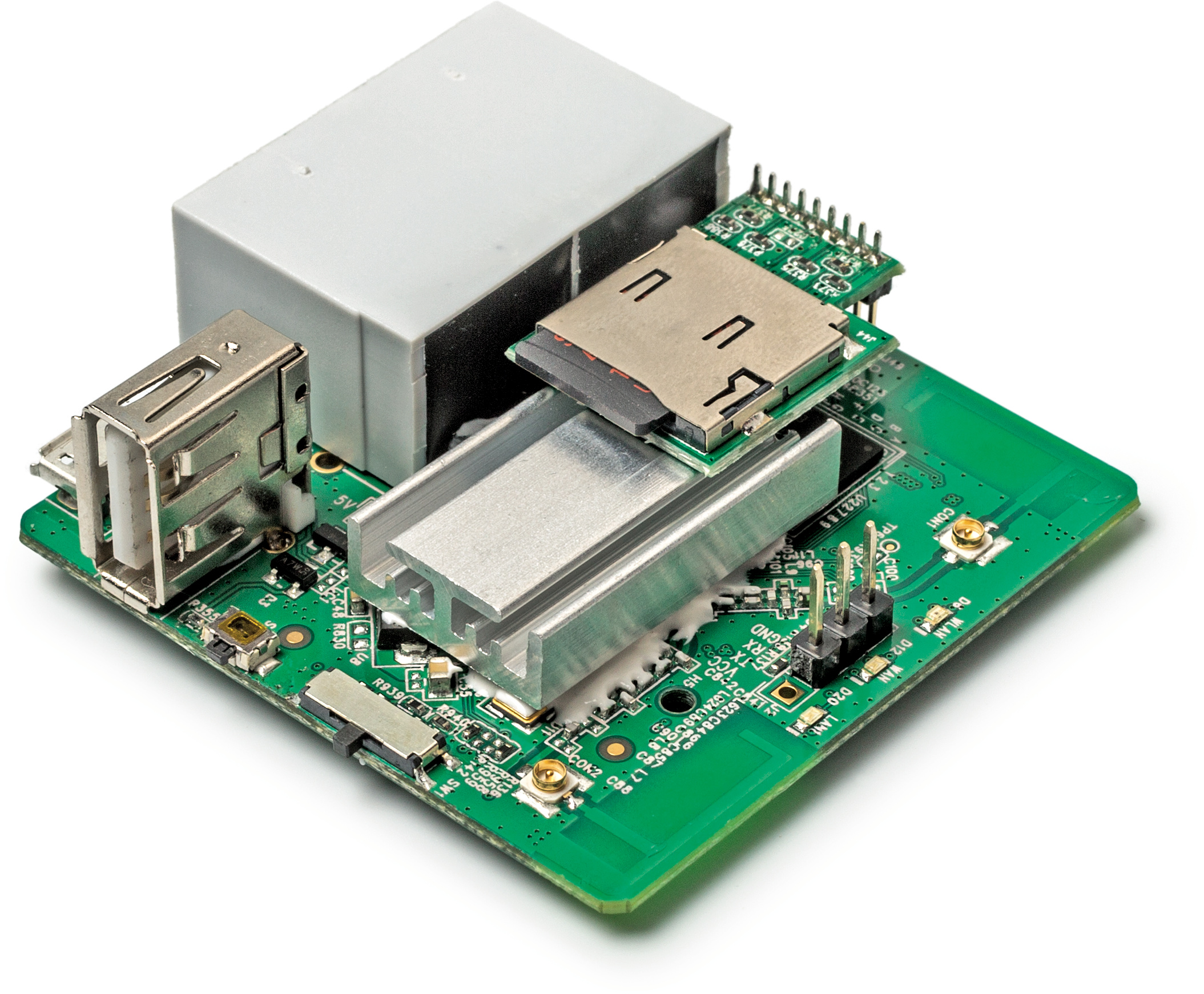 Der integrierte Micro-SD-Slot steht als Speichermedium für beliebige Anwendungen, wie zum Beispiel als NAS, zur Verfügung. Um ihn zu erreichen, muss man den Router öffnen. Die Platine fällt positiv auf: GL.iNet hat dem Prozessor einen passiven Kühler spendiert. Darüber sitzt der Micro-SD-Slot, der über lange Pins an die Platine gelötet ist. Das sieht auf den ersten Blick etwas fragil aus, die Pins halten den Slot aber zuverlässig an Ort und Stelle. Die SD-Karte ist direkt mit der SDIO-Schnittstelle des Prozessors verbunden. Trotz beworbener Grenze von 64 GByte erkannte der Router eine 128-GByte-Karte von SanDisk problemlos. Falls per Netzwerk mal gar nichts mehr geht, erreicht man die Konsole des GL-MT300A über die serielle Schnittstelle. Drei 2,5-mm-Pins sind dazu bereits aufgelötet.