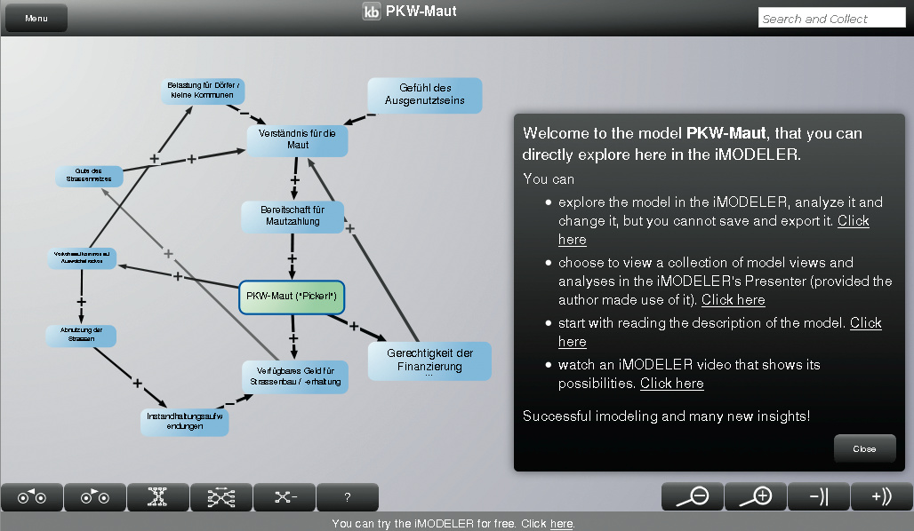 Mit dem iModeler von Consideo lassen sich die Einflussgrößen komplexer Systeme grafisch miteinander verknüpfen (siehe c’t 7/13, S. 158). Abhängigkeiten und zeitliche Verläufe kann der Anwender quantitativ über Formeln berücksichtigen und grafisch darstellen. Der im aktuellen iModeler 8 eingeführte IM-Optimizer hilft, günstige Wertekombination auf Grundlage vorgegebener Bedingungen zu finden. Der Nutzer definiert als Ziel beispielsweise ein festes Budget und ermittelt auf dieser Grundlage den maximalen Profit. Mit dem ebenfalls neuen IM-Data-Manager lassen sich quantitative Daten automatisch aus CSV- oder Excel-Dateien importieren oder dorthin exportieren.