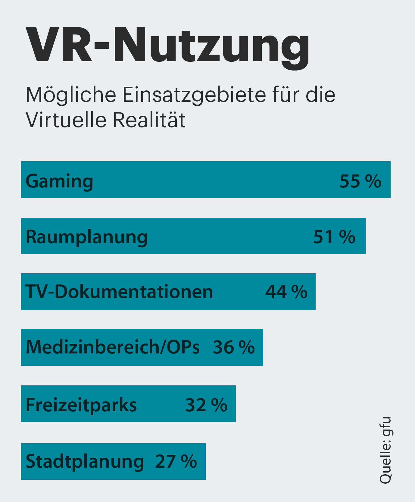 Im Rahmen ihrer Befragung hat sich die gfu auch nach dem Trendthema Virtual Reality erkundigt – was halten die Konsumenten von VR und was wollen sie damit am liebsten anstellen? Das Ergebnis war etwas ernüchternd: Zwar besitzen bereits 4 Prozent der Befragten eine VR-Brille, aber nur weitere 15 Prozent interessieren sich überhaupt für VR. Der weitaus größte Teil der befragten Konsumenten (63 %) hat kein Interesse an der virtuellen Realität, 18 Prozent wissen nicht einmal, worum es dabei geht.