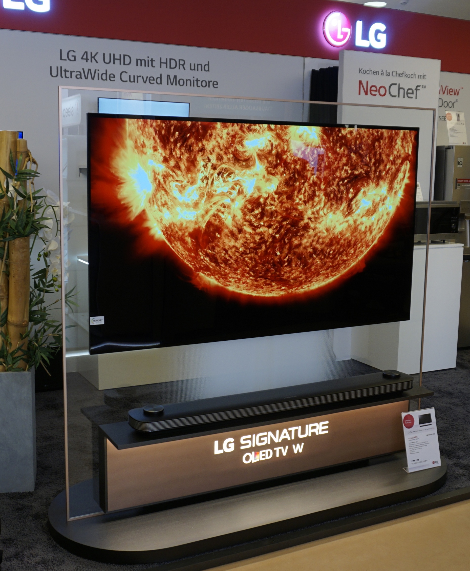 Auch LG hat mit seinem Wallpaper-TV ein Designerstück geschaffen, das sich im wahrsten Sinne des Wortes nahtlos einfügt. Das biegsame, wenige Millimeter dünne OLED ist nun auch mit 77 Zoll Diagonale erhältlich, für nicht ganz billige 20.000 Euro; die 65-Zoll-Variante kostet „nur“ 8000 Euro.