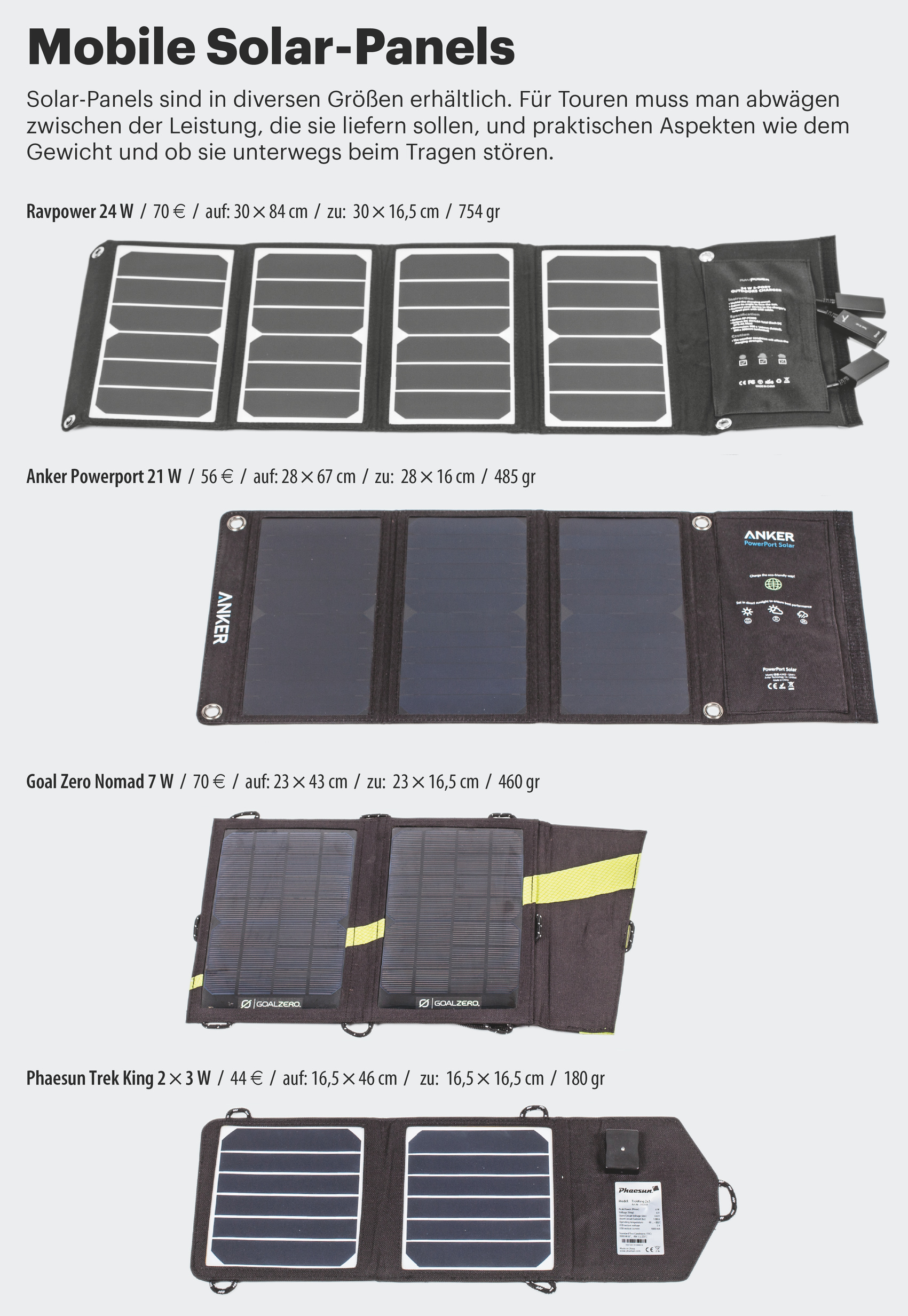 Solar-Panels für unterwegs finden sich in unterschiedlichsten Darreichungsformen: als spielkartengroßes Gimmick auf einem Powerpack aufgeklebt, aber auch als klappbares Panel-Pack in Taschenbuch- oder DIN-A4-Größe. Wir haben einige Modelle über mehrere Wochen ausprobiert: die taschenbuchgroße Klappzelle von Phaesun (6 Watt) und – in der Größe aufsteigend – das Panel Goal Zero Nomad 7 (7 Watt), das Anker Powerport (11 Watt) sowie die 24-Watt-Panels Xtorm Solarbooster und Ravpower.