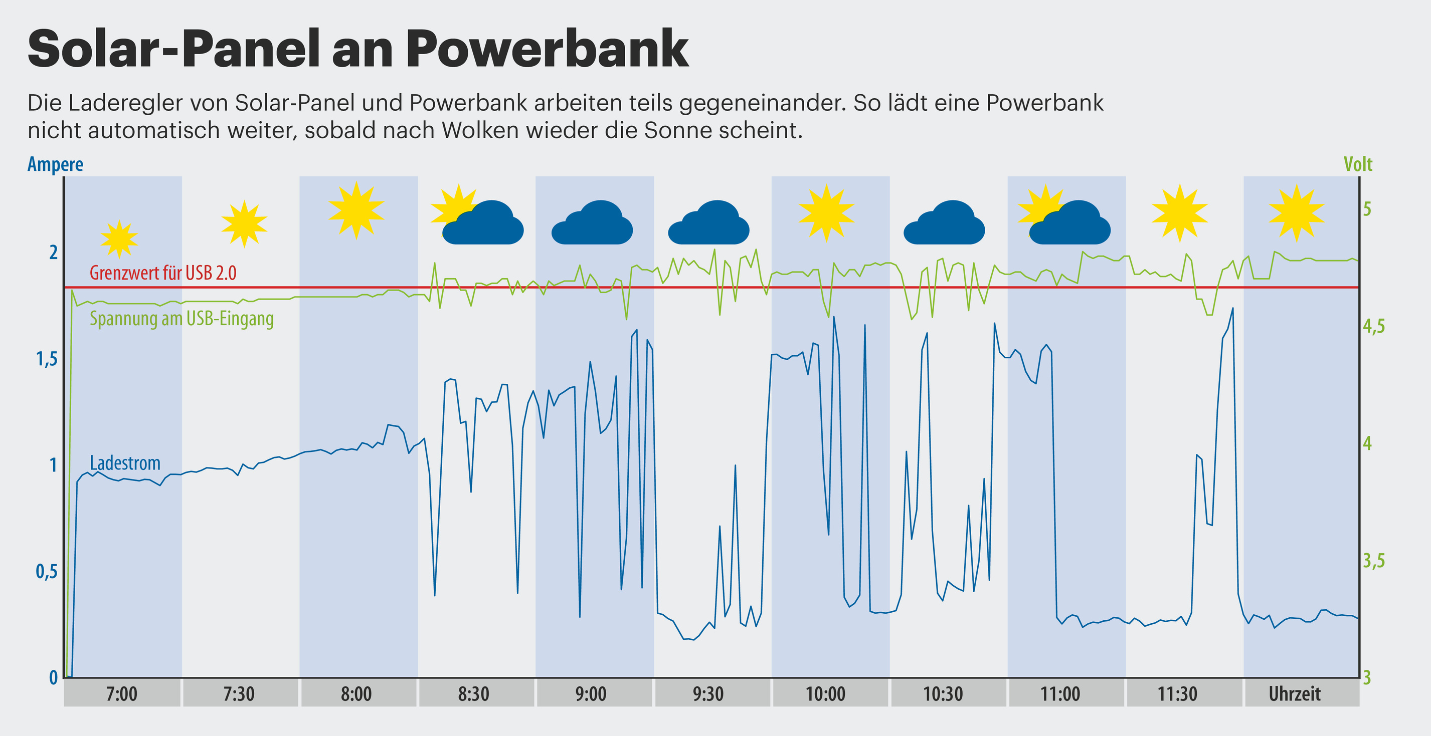 Sobald ein Solar-Panel nur wenige Milliampere abgibt – etwa weil das Panel gerade im Schatten liegt –, senkt der Lade-Controller im Panel die Spannung des USB-Ausgangs auf weniger als 4,75 Volt, also unterhalb der USB-2.0-Norm. Das verhindert, dass Smartphones am Panel zicken. Erst wenn das Panel wieder genug Strom produziert, schaltet es den USB-Ausgang erneut frei. Für das Smartphone sieht das so aus, als sei das Ladekabel erneut eingestöpselt worden und es lädt wieder.
