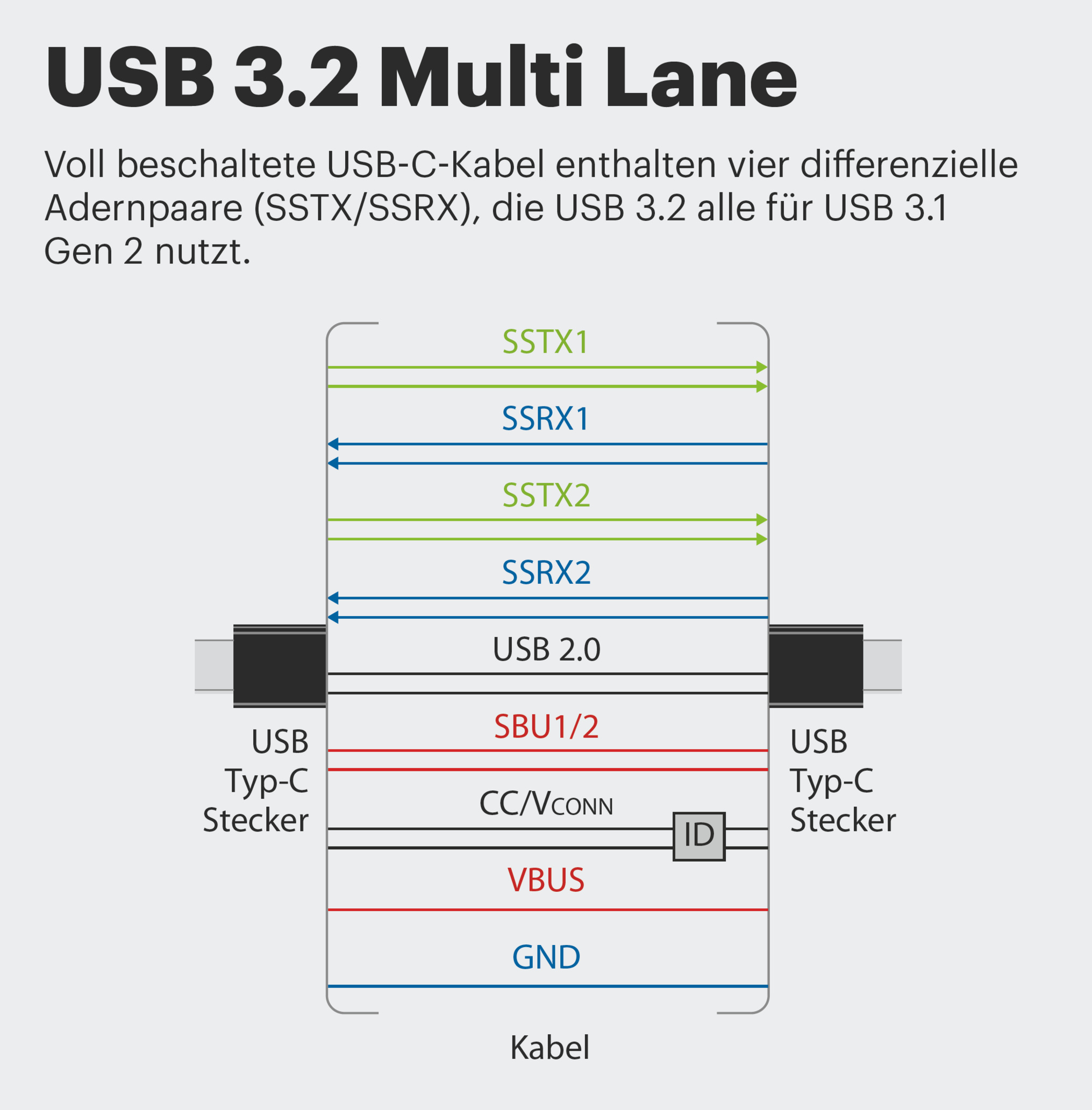 Die kommende Version 3.2 der USB-Spezifikation bringt Multi-Lane-Technik, die die Datentransferraten bei USB Typ C potenziell verdoppelt: auf 20 GBit/s statt 10 GBit/s wie bei USB 3.1 Gen 2 alias SuperSpeed+. USB 3.2 Multi-Lane funktioniert mit denselben USB-C-Buchsen und -Kabeln wie bisher, sofern die Kabel komplett beschaltet sind. Denn USB-C sieht schon jetzt vier differenzielle Adernpaare vor, von denen nur zwei für USB SuperSpeed und SuperSpeed+ (USB 3.1 Gen 1/Gen 2) nötig sind. Die beiden anderen kommen bisher vor allem für den DisplayPort Alternate Mode (DP Alt) zum Einsatz, um DisplayPort-Signale via USB-C an Monitore zu übertragen.