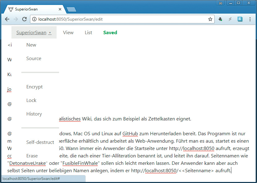 cowyo steht für Windows, macOS und Linux auf GitHub zum Herunterladen bereit. Das Programm ist nur mit englischer Bedienoberfläche erhältlich und arbeitet als Web-Anwendung. Führt man es aus, startet es einen Web-Server auf Port 8050. Wann immer ein Anwender die Startseite unter http://localhost:8050 aufruft, erzeugt cowyo eine neue Wiki-Seite, die nach einer Tier-Alliteration benannt ist, und leitet ihn darauf. Seitennamen wie „DetonativeDrake“ oder „FusibleFinWhale“ sollen sich leicht merken lassen – ein nutzloses Gimmick. Glücklicherweise kann der Anwender aber auch selbst Seiten unter beliebigen Namen anlegen oder vorhandene weiterbearbeiten, indem er http://localhost:8050/<Seitenname> aufruft.