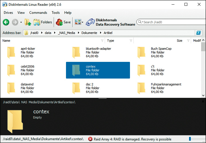 Allerdings klappt diese Methode nur, wenn Sie eine Einzelplatte oder ein RAID 1 (Datenspiegelung ohne Parität) im Einsatz hatten. Wurden die Daten per RAID 5 oder 6 über mehrere Laufwerke verteilt, können Sie die Platten in ein Ersatz-NAS derselben Baureihe einbauen oder kostenpflichtige Software einsetzen. Manchmal kann man die Daten auch an einem Linux-PC zusammenpuzzeln, falls das RAID mit mdraid konfiguriert wurde. (ll@ct.de)