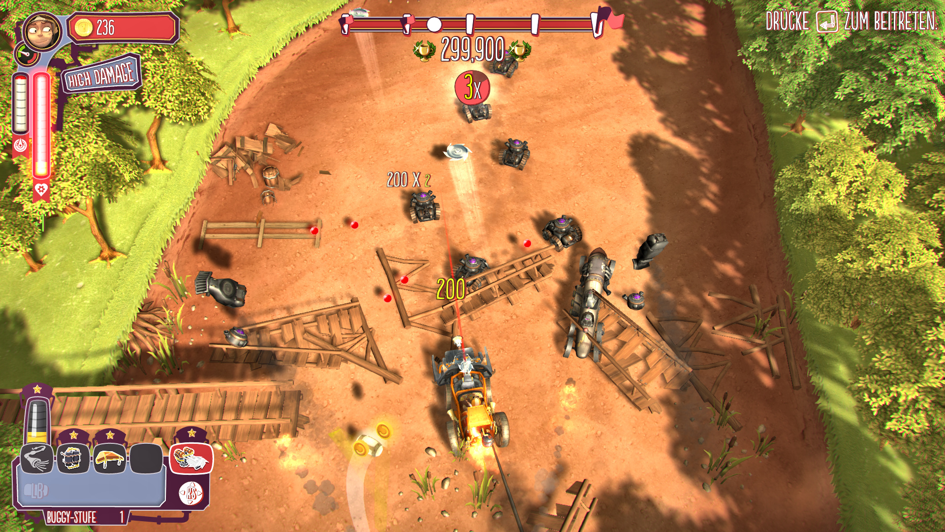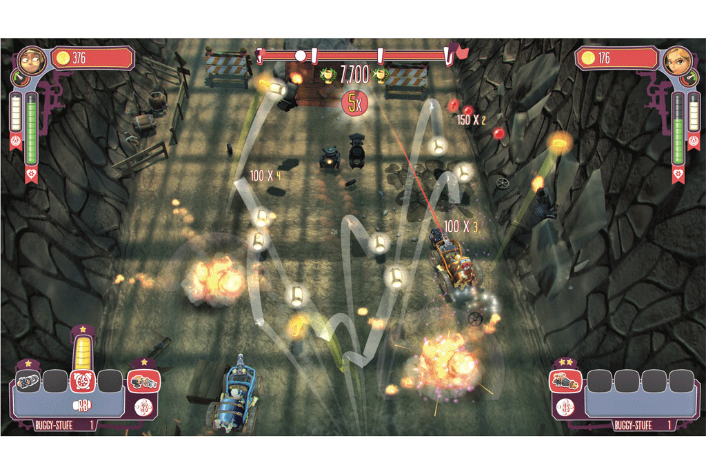 Im runderneuerten Pressure Overdrive, das auf dem 2013er Pressure beruht, lässt das kleine Stuttgarter Studio Chasing Carrots es so richtig krachen. Spieler jagen hier zu zweit oder solo durch eine sympathisch gestaltete Steampunk-Welt. Bereits bei Pressure legten die schwäbischen „Möhren“ mehr Wert aufs Schießen als aufs Fahren. Dem bleibt auch der neu aufpolierte Titel treu – er widmet sich demselben Gegenstand, aber alles sieht irgendwie deutlich besser aus als zuvor. Man betrachtet die Strecke von hoch oben aus der Vogelperspektive. Gesteuert wird am besten per Controller, wobei die Lenkung gewöhnungsbedürftig ist. Der linke Stick am Controller dient dazu, den Wagen zu beschleunigen, abzubremsen und zu lenken. Der rechte richtet die Hauptwaffe aus und feuert sie ab. Angebaute Extras wie Turboboost oder Bombenwerfer aktiviert man über die Schultertasten. Wichtig ist, dass man immer genug Dampf hat, um Wagen und Waffen mit Energie zu versorgen. Sobald der Dampfdruck aufs Minimum zurückgeht, reduzieren sich Schussfrequenz und Geschwindigkeit deutlich.