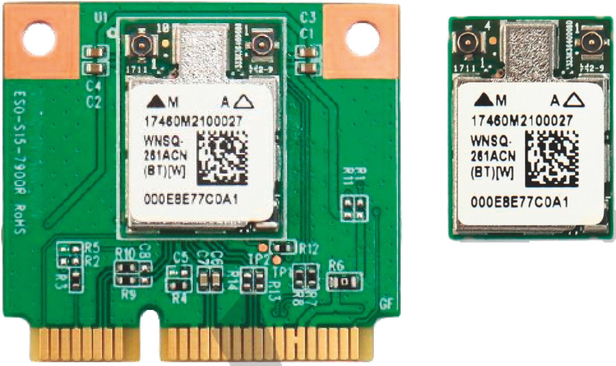 Das M.2-Kärtchen WNSQ-261ACN im 1216-Format (12 mm × 16 mm) eignet sich für besonders kompakte Geräte; es sitzt als Modul auf der Mini-PCIe-Variante WPEQ-261ACN. Mit der lassen sich auch ältere Notebooks mit modernem WLAN nachrüsten, falls deren Hersteller keine BIOS-Sperre gegen fremde Karten implementiert hat. Ferner müssen die Antennenstecker zu den IPEX/MHF4-Buchsen des Kärtchens passen. Ansonsten werden U.FL-zu-MHF4-Adapter nötig. (ea@ct.de)